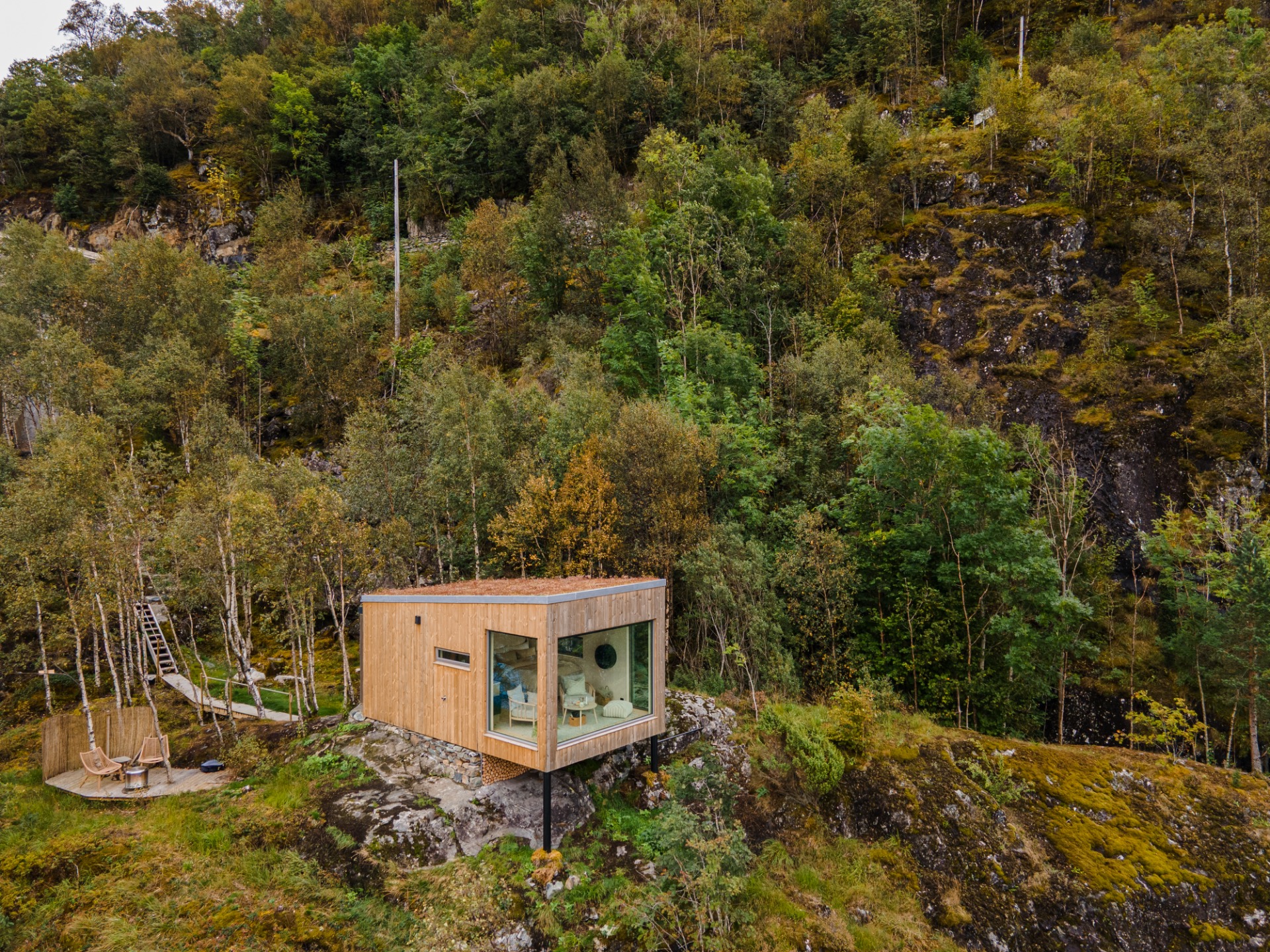 Hyttene heter Fjord og Fjell. De er like i utforming, men plassert slik at hver hytte gir sin egen opplevelse av utsikt, ro og omgivelser.
